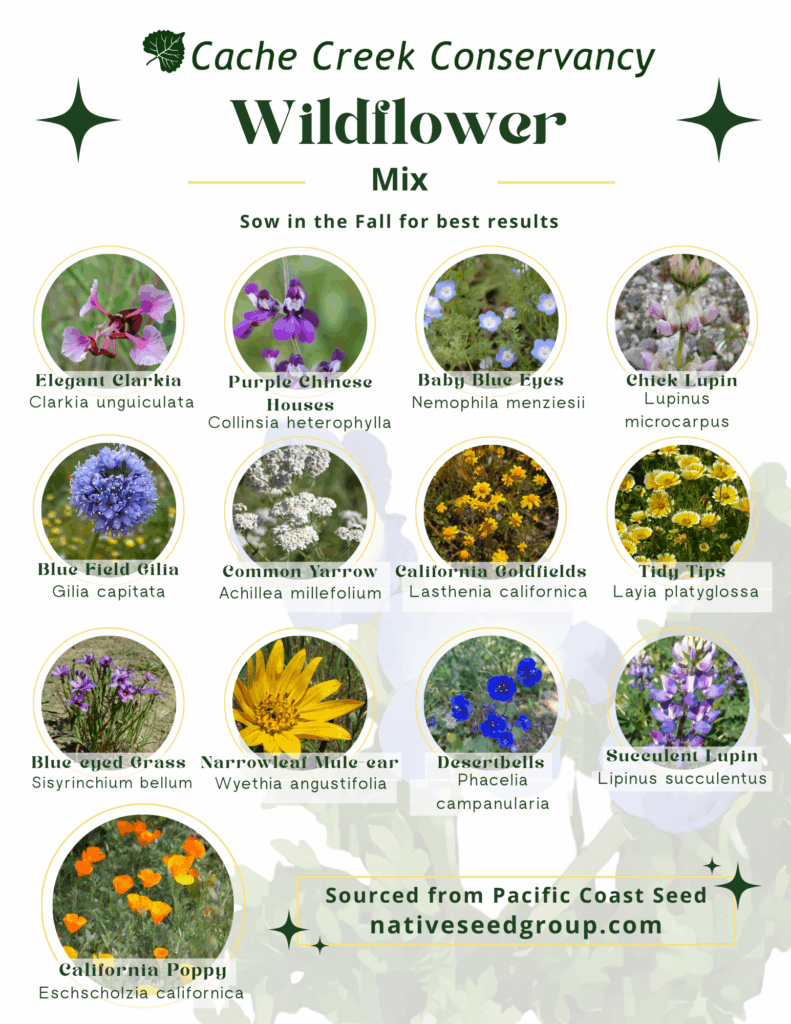 Congratulations! You have received a Cache Creek Conservancy wildflower seed packet. These seed packets contain a mixture of wildflower seeds native to the California’s Sacramento Valley. Many of the flower species have a range that is wider than the Central Valley, and may even extend beyond the California Border, although we try to source local ecotypes when possible through Hedgerow Farms. Please note that this is a seed mixture, so there is no guarantee of which flower species are in the seed packet, or which will germinate.